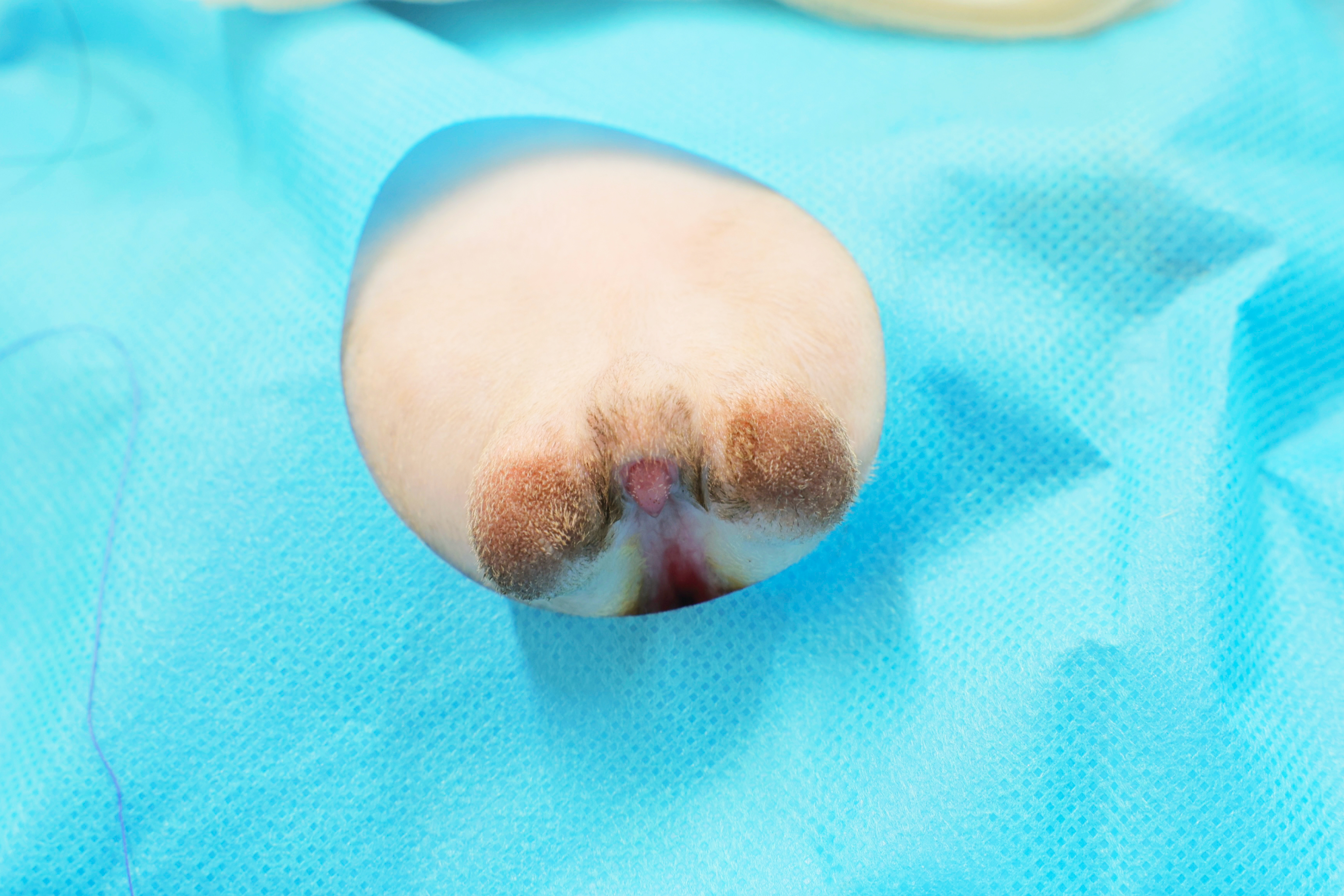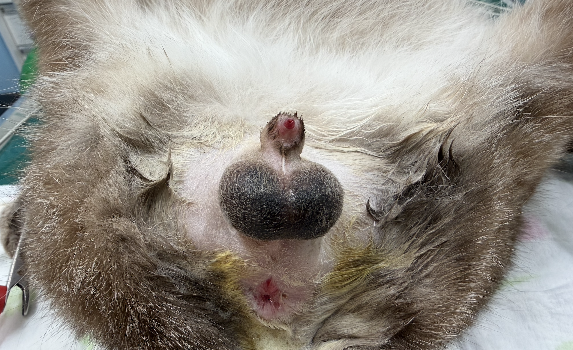 メスの生殖器である子宮卵巣の摘出手術を受けた際の詳細は不明なので、それらがどのような状態であったかはわかりかねるのですが(しっかり存在していたのか、奇形や未熟な状態だったのかどうかなど)、オスの外部生殖器(陰嚢)も写真のように通常の位置・形とは異なっていました。