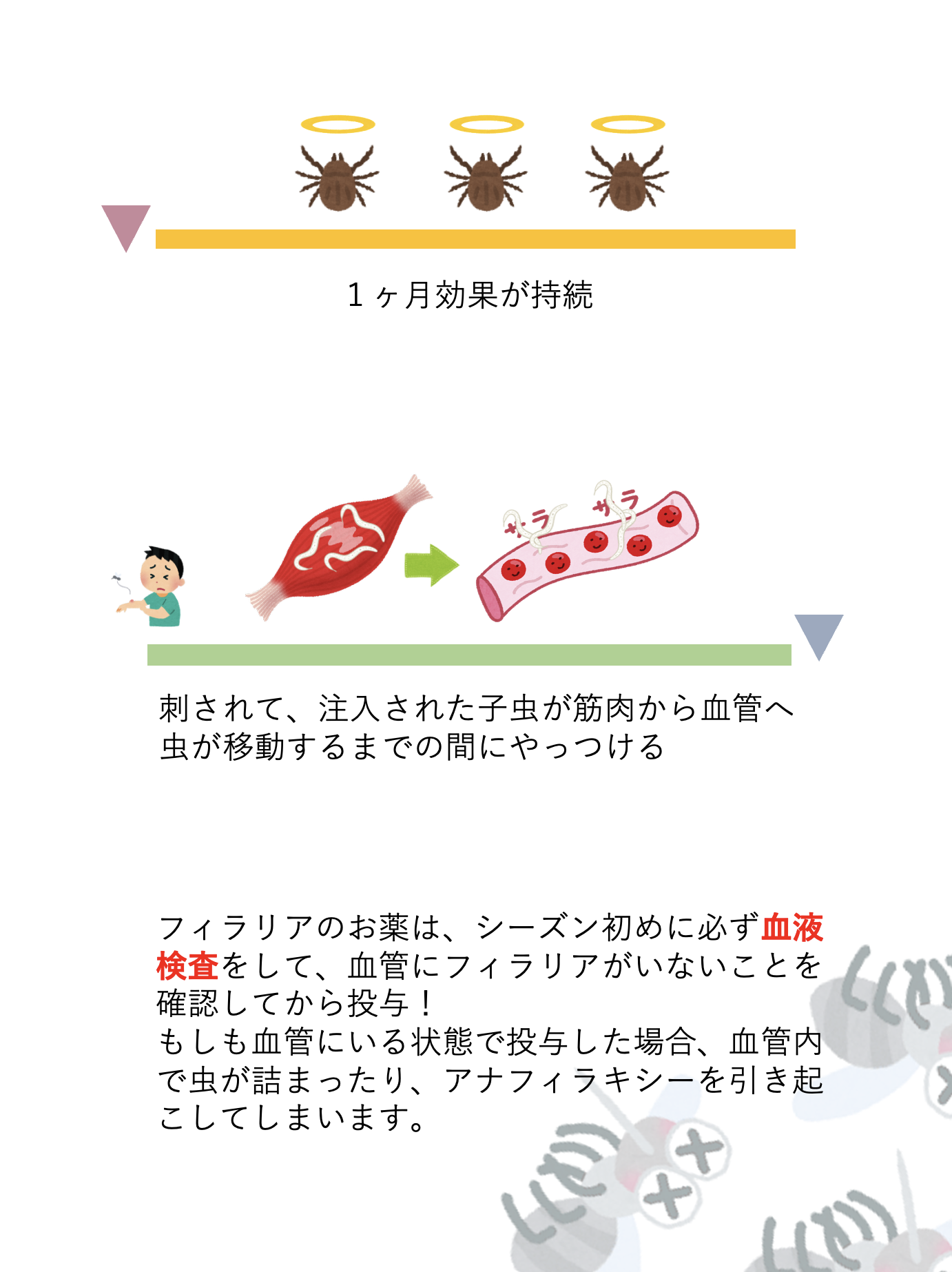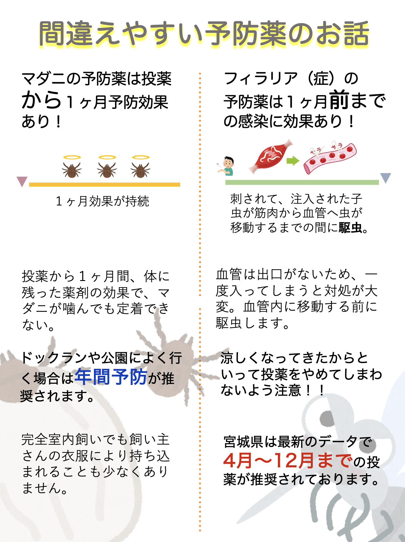 以下にマダニ予防薬とフィラリア予防薬の違いを記しましたが、フィラリア予防薬は、正確にいうと駆虫薬のため、感染した後1ヶ月後に飲ませる必要があるのです。