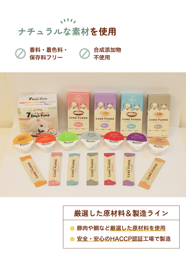 使用されている食材は、普段なかなか与えることができないものばかり。(これらの食材を全部揃えようとするだけでも大変ですし、まして手作りで作ってあげようとしても労力の凄まじいこと間違いなし・・。)