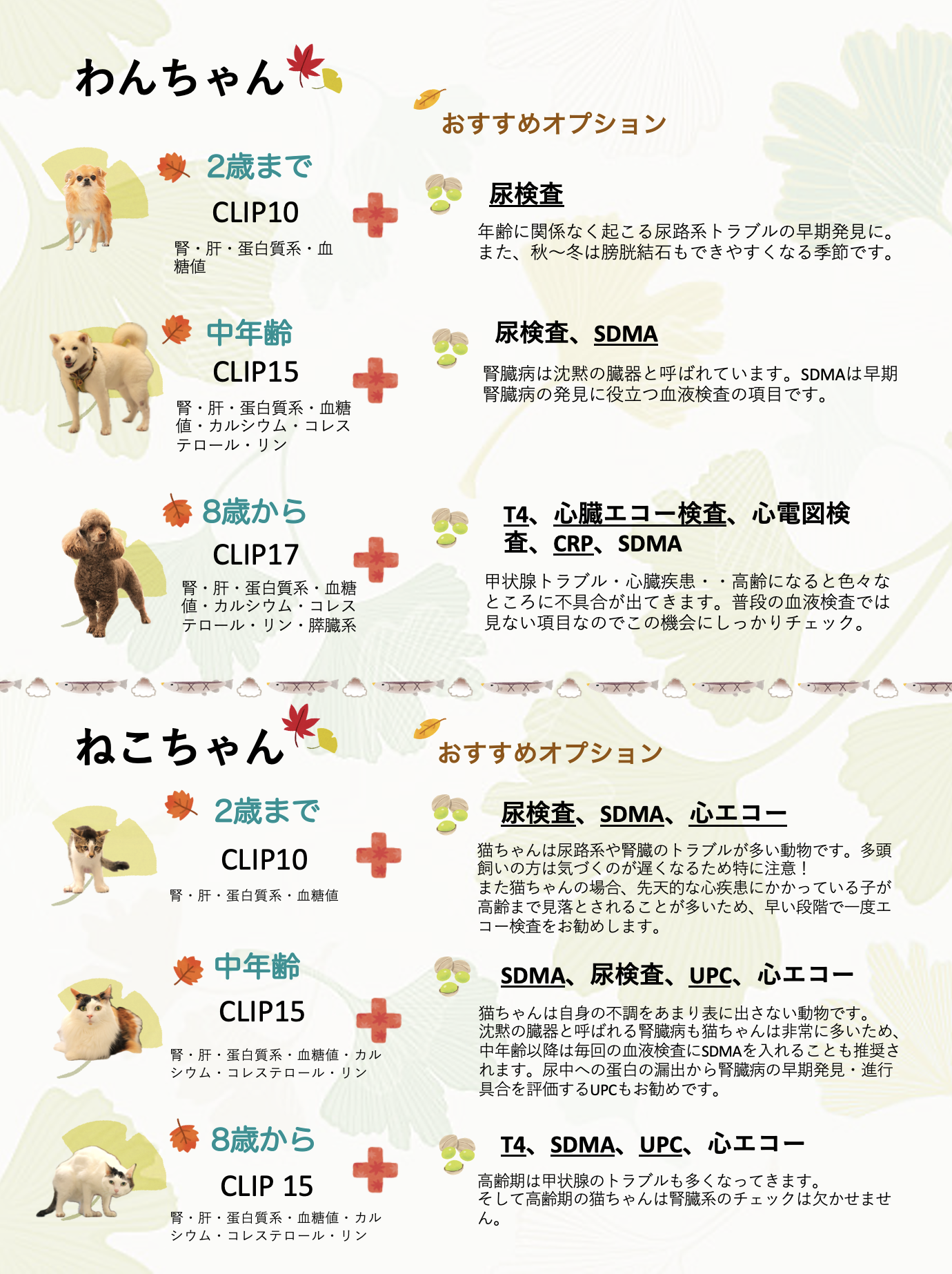 それぞれの気になる点により、上記のコースに加え、オプションを追加されると良いと思いますが、中年齢以降の子にはワンちゃん・猫ちゃんともにSDMAがおすすめとなります。こちらは早期に腎臓病を診断できる項目となります。