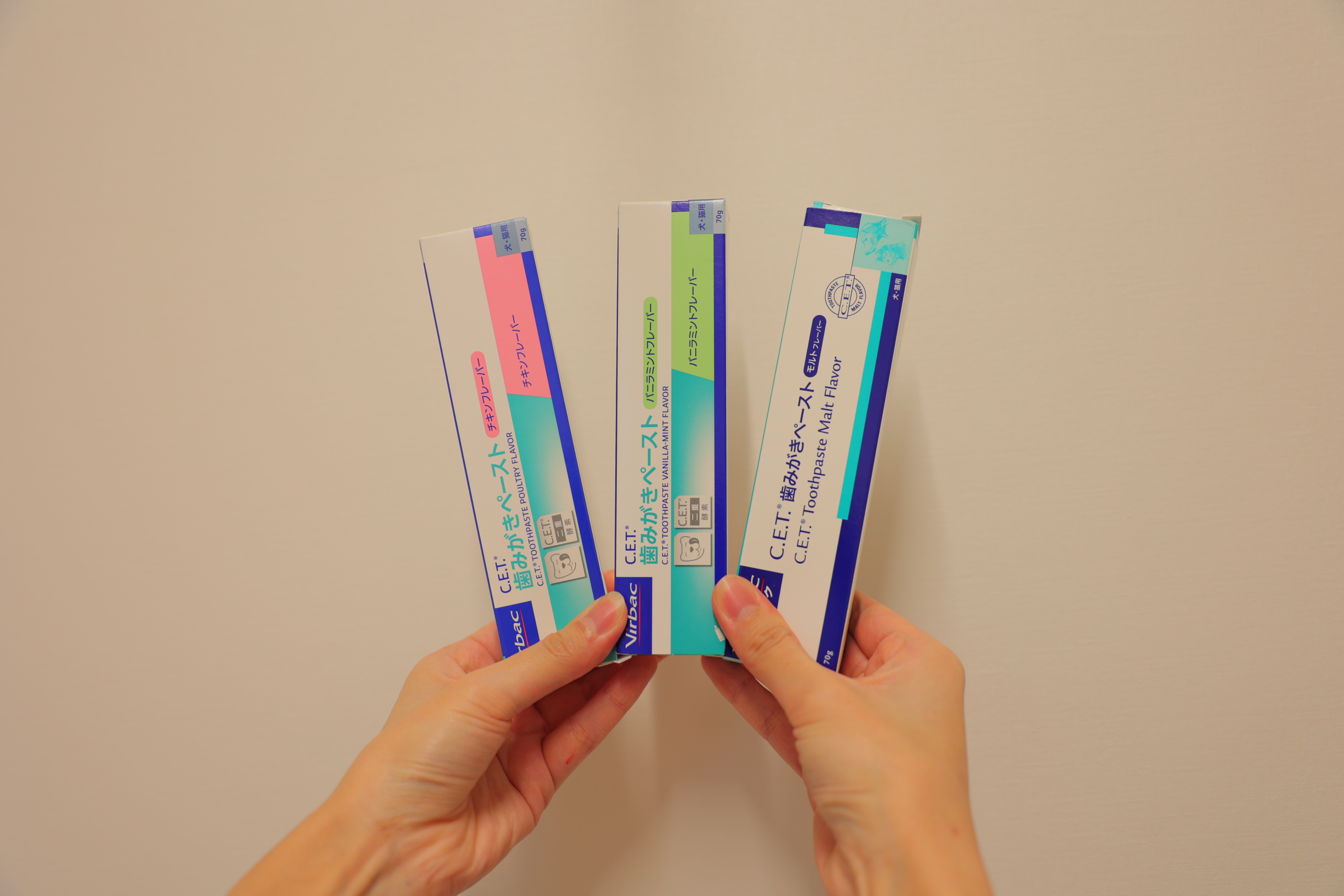 ビルバックさんのCET歯磨きペーストはお味がバニラ・チキン・モルト・シーフードの4種類ございますが、人気はバニラとチキンです。(シーフードは他3種類と比べて緩めのペーストです。)