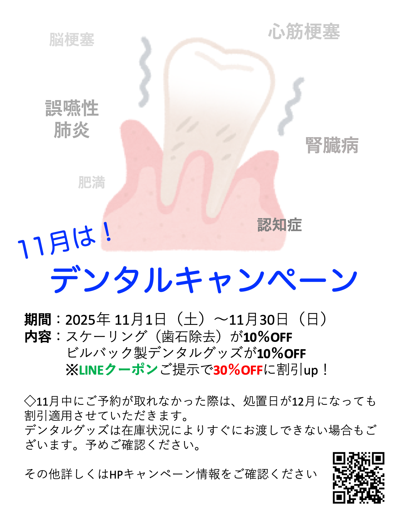 11月ということで、良い歯(11/8)の日にかけまして、スケーリング(歯石除去)がお得になるキャンペーンを開催いたします!