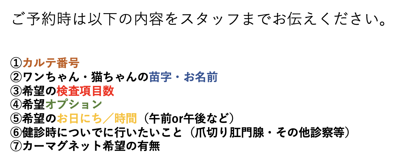 ※健康診断キャンペーン期間中は、ご予約の方を優先にお呼びいたしておりますが、急患や手術・諸事情によりご予約通りにお呼びできない場合も起こりえます。その際はご理解ご協力をお願いいたします。