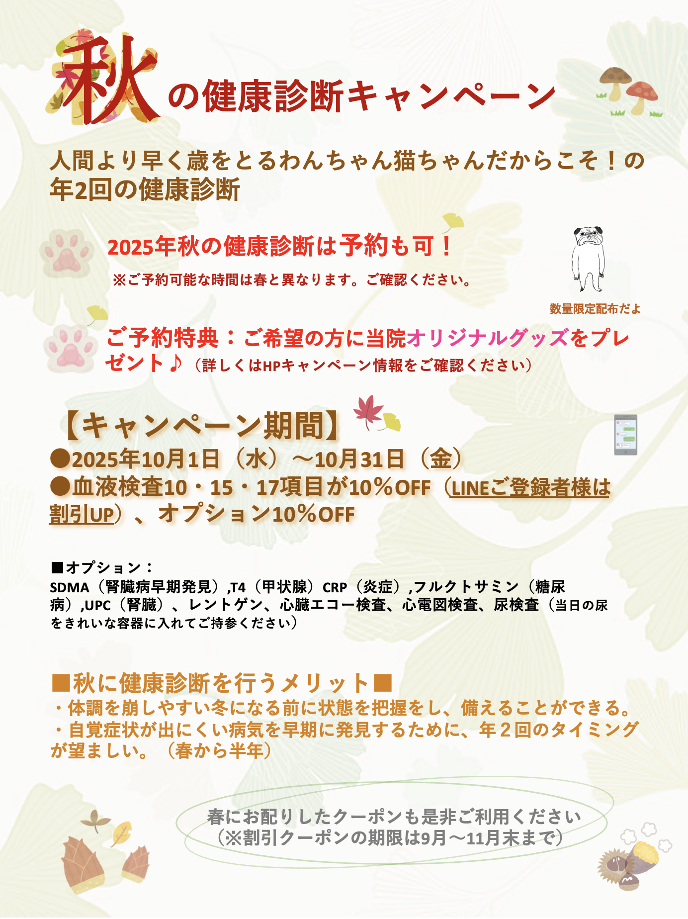 春にお配りしたエコー検査無料券or糞便検査半額券も9月〜11月の間でご使用できますので、ぜひこの機会に一緒にご利用ください♪